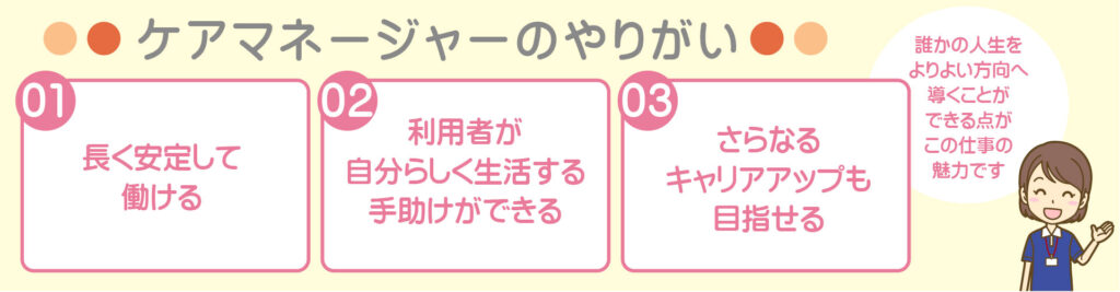 | 必要な経験・免許・資格等 | ・介護支援専門員(ケアマネージャー)必須 ・ケアマネとしての実績経験 必須 |
